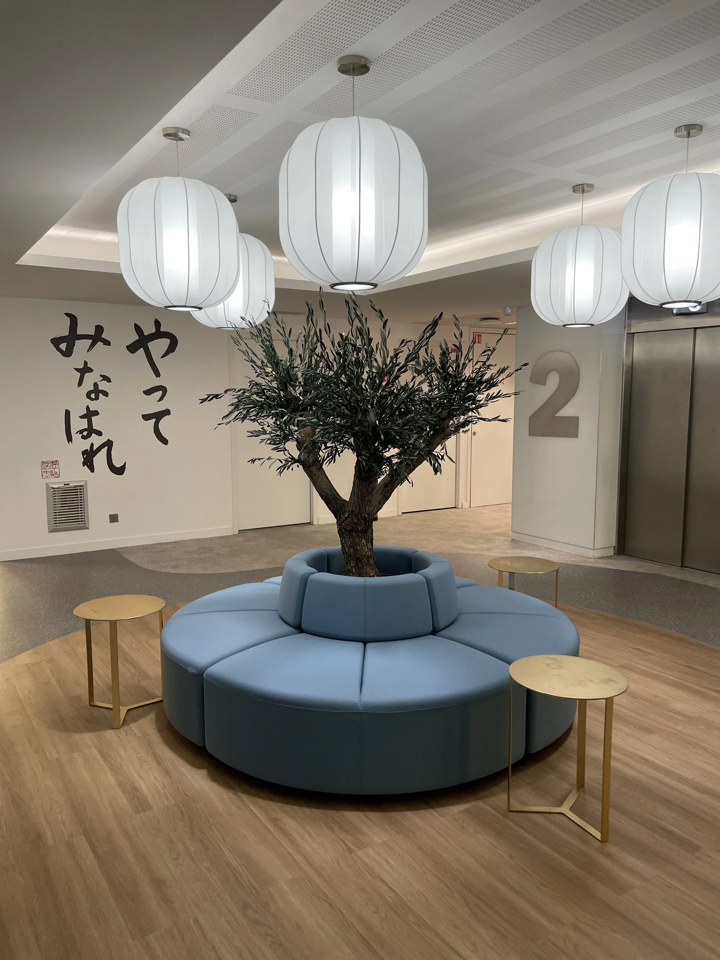 Enfin, pour marquer l’arrivée dans les locaux, nous avons installé un olivier stabilisé. Un élément fort, symbole de longévité et de sérénité, qui apporte immédiatement du cachet et de la personnalité à l’espace d’accueil. La personnalisation de cet arbre stabilisé unique peu être complète, allant même jusqu’au choix du tronc (forme, hauteur, épaisseur, écorce…) !