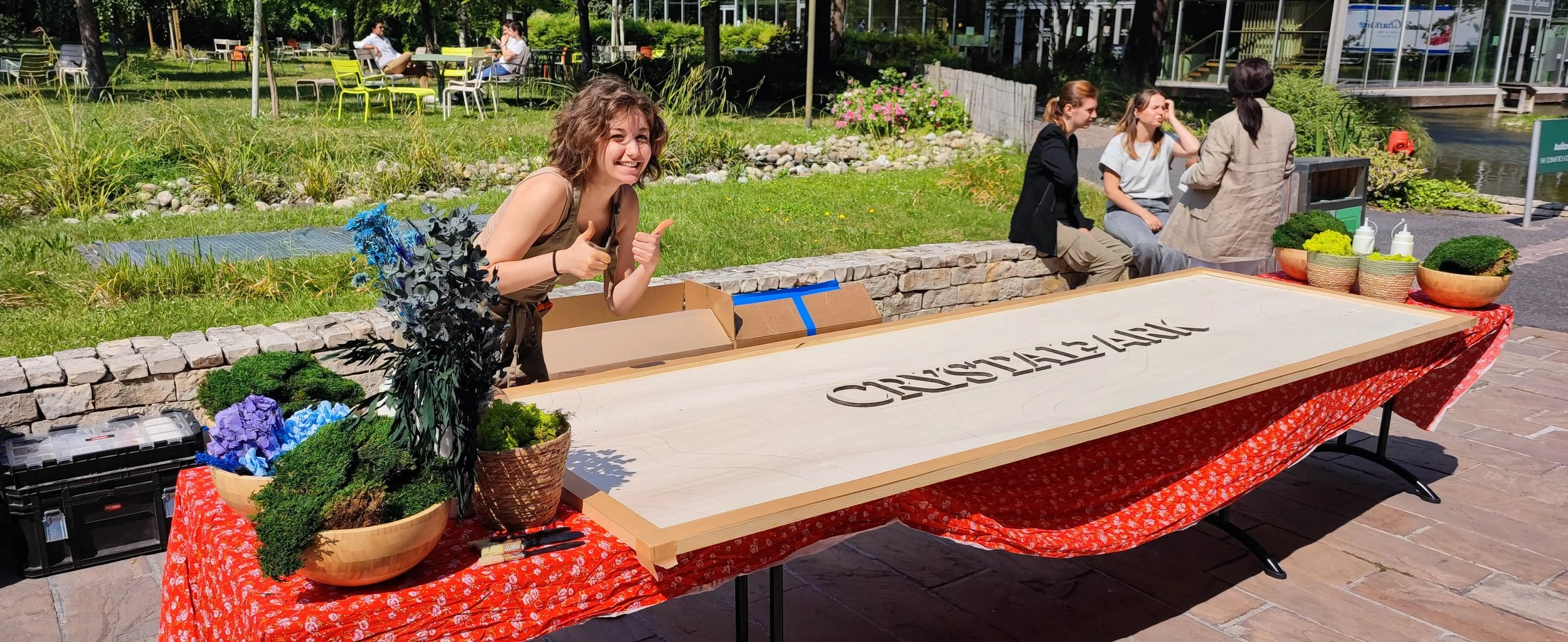 Une fois tous les éléments à disposition, au boulot ! Ponçage du tableau en bois, peinture et pose du lettrage, sélection des végétaux, préparation du matériel pour l’événement et du nécessaire hygiénique, organisation du transport…